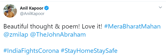 "Beautiful thought & poem! Love it!#MeraBharatMahan@zmilap@TheJohnAbraham", his tweet read.