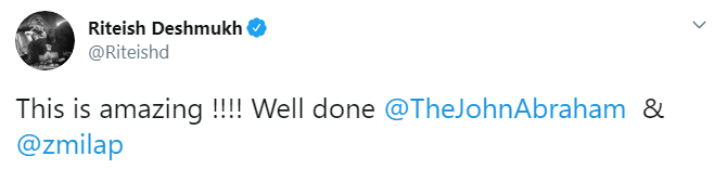 This is amazing !!!! Well done @TheJohnAbraham& @zmilap, the 41-year-old actor tweeted.