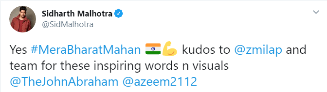 "Yes #MeraBharatMahan kudos to @zmilapand team for these inspiring words n visuals @TheJohnAbraham@azeem2112", the 'Ek Villian' tweeted.