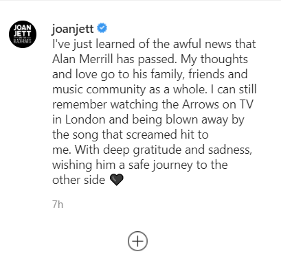 "I've just learned of the awful news that Alan Merrill has passed. My thoughts and love go to his family, friends and music community as a whole. I can still remember watching the Arrows on TV in London and being blown away by the song that screamed hit to me. With deep gratitude and sadness, wishing him a safe journey to the other side," the statement read.