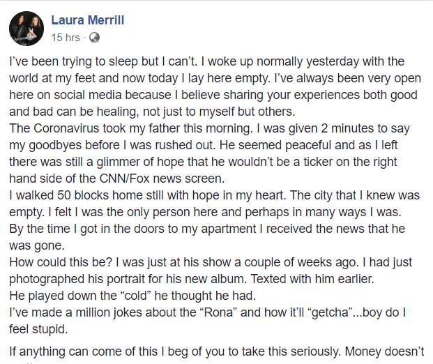 "The Coronavirus took my father this morning," she wrote.