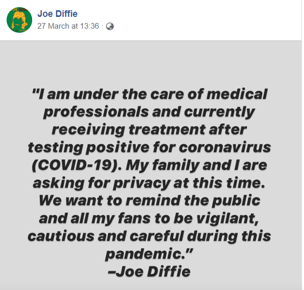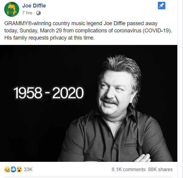 The news was shared on the official Facebook page of the star which said he died on Sunday "from complications of coronavirus."