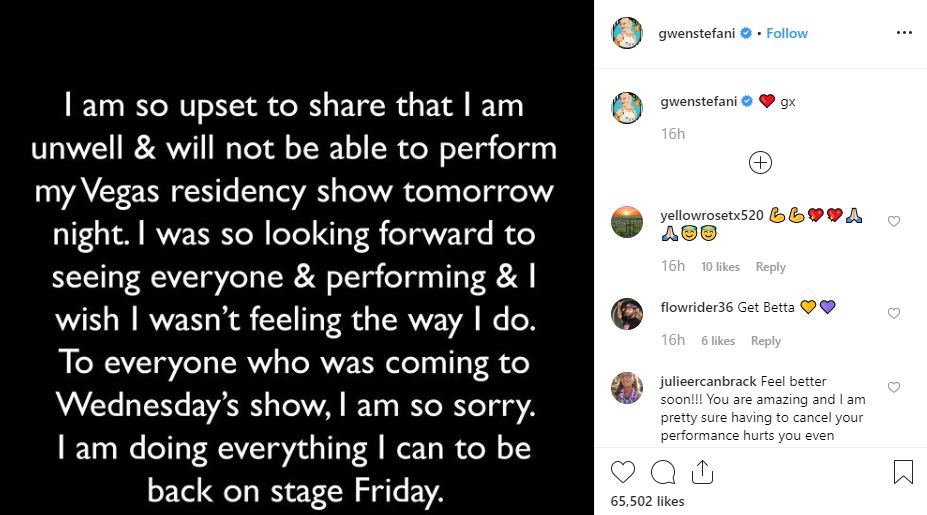 On Tuesday night, the 'Hollaback Girl' singer announced in a statement on Instagram that she was calling off her upcoming performance in Las Vegas on Wednesday night because she is currently "unwell."