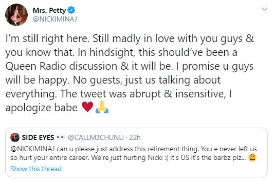 In the tweet, Minaj also added that this should have been a Queen Radio discussion and added, "In hindsight, this should've been a Queen Radio discussion & it will be. I promise u guys will be happy. No guests, just us talking about everything."