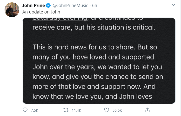 "After a sudden onset of COVID-19 symptoms, John was hospitalized on Thursday (3/26). He was intubated Saturday evening and continues to receive care, but his situation is critical," the statement read.