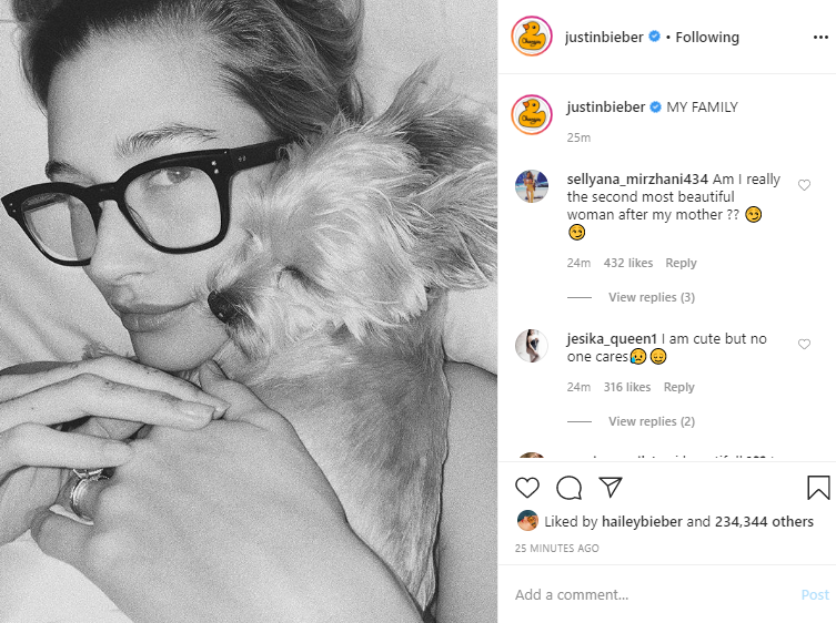 The 26-year-old singer hopped on to Instagram and shared a monochrome picture of his wife Hailey Bieber and their pet puppy.