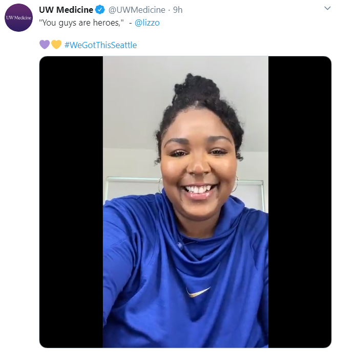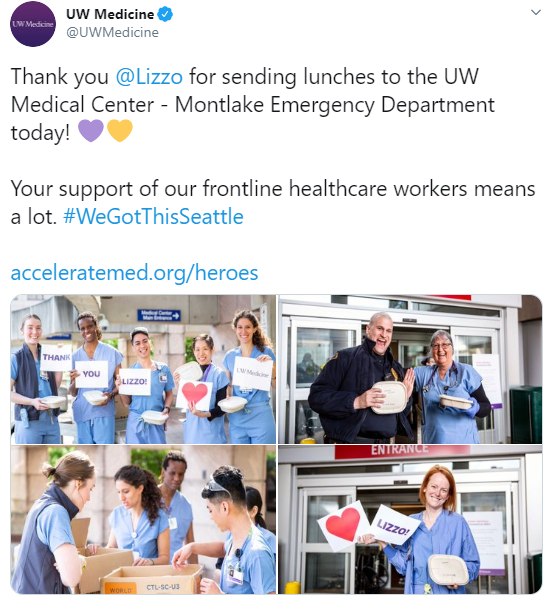 "Thank you @Lizzo for sending lunches to the UW Medical Center - Montlake Emergency Department today!" the hospital tweeted.