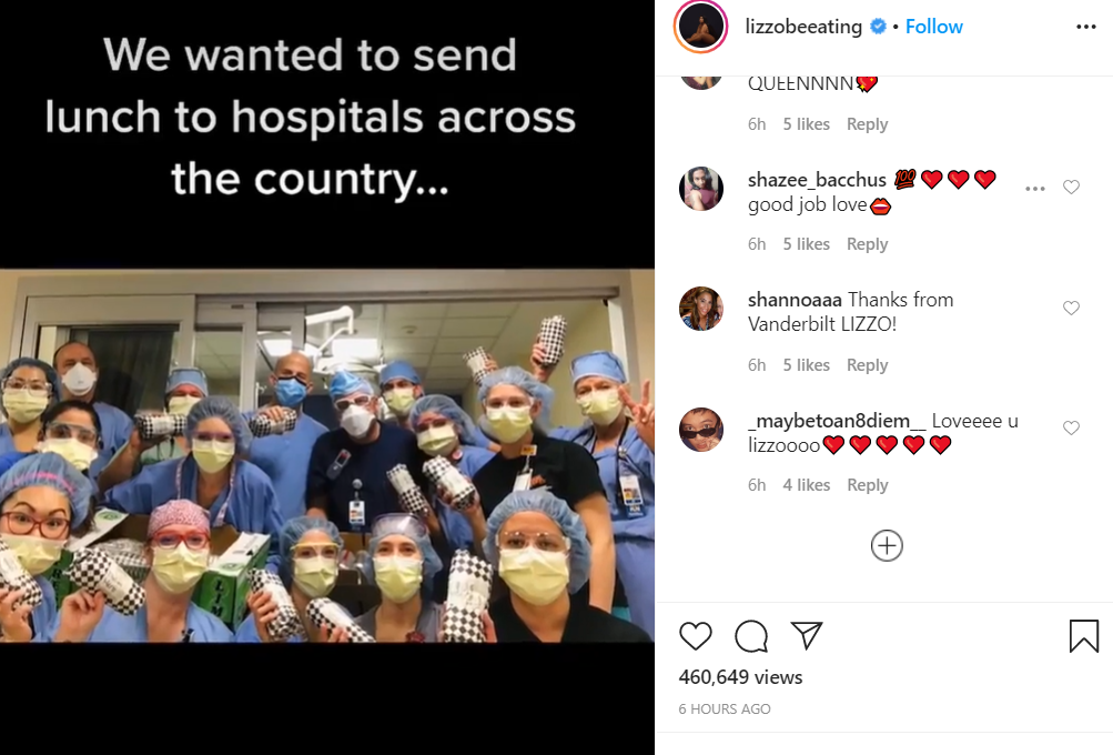 Lizzo on Tuesday (local time) posted a short video on her Instagram featuring clips and photographs of hospital workers with the meals she sent.
