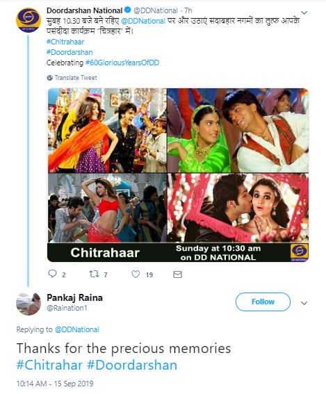 Reminiscing about 'Chitrahar' one of the most awaited and love programme on Doordarshan, a user wrote: "Thanks for the precious memories #Chitrahar #Doordarshan."