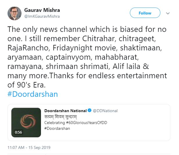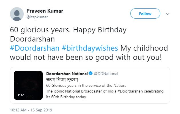 "60 glorious years. Happy Birthday Doordarshan #Doordarshan #birthdaywishes My childhood would not have been so good without you!" he tweeted.