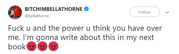 "F**k and the power u think you have over me. I'm gonna write about this in my next book," she wrote on Twitter.