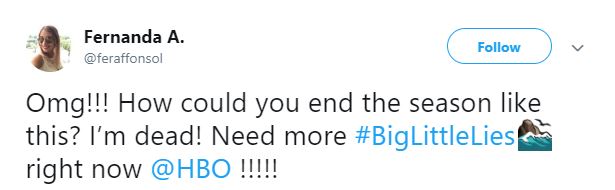 Another fan, who seemed to be disappointed with the show ending so quickly, wrote, "Omg!!! How could you end the season like this? I'm dead! Need more #BigLittleLies right now @HBO."