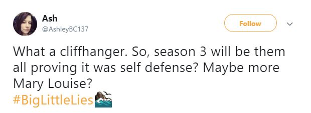 Calling the season a "cliff hanger", a fan wrote, "What a cliffhanger. So, season 3 will be them all proving it was self-defense? Maybe more Mary Louise?"