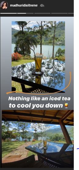 Dixit, who is currently on a vacation shared a soothing picture of her iced tea amidst lush green mountains and a lake in the background on Instagram.