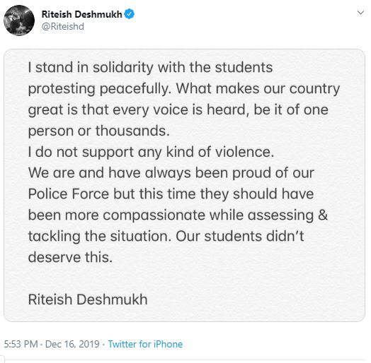 Actor Riteish Deshmukh also expressed solidarity with the student protest and said that every voice must be heard in a vibrant democracy.