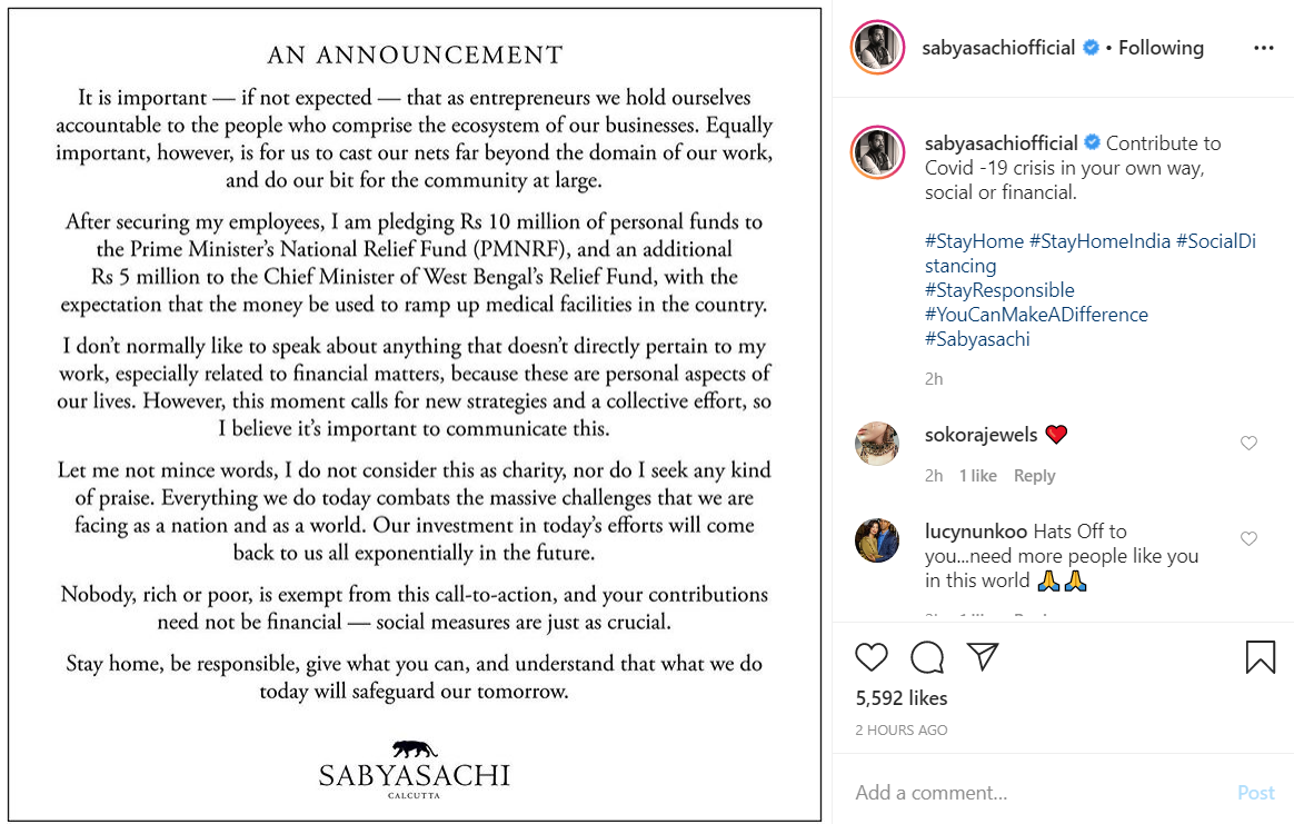 "After securing my employees, I am pledging Rs 10 million of personal funds to the Prime Minister's National Relief Fund (PMNRF), and an additional Rs 5 million to the Chief Minister of West Bengal's Relief Fund, with the expectation that the money is used to ramp up medical facilities in the country," the statement reads.