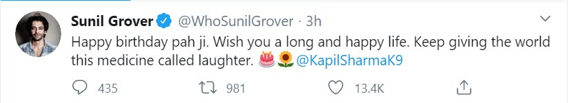 "Happy birthday pah ji. Wish you a long and happy life. Keep giving the world this medicine called laughter.@KapilSharmaK9," the tweet read.