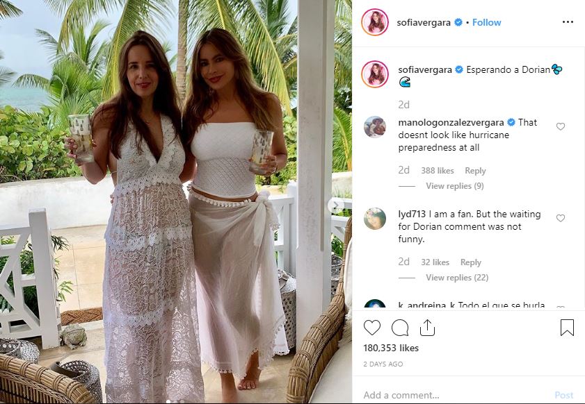 In a picture Vergara posted on Wednesday with her girlfriends each with glasses of drinks in their hands, she mentioned Hurricane Dorian and captioned, "Esperando a Dorian" which translates to waiting for Dorian in English.
