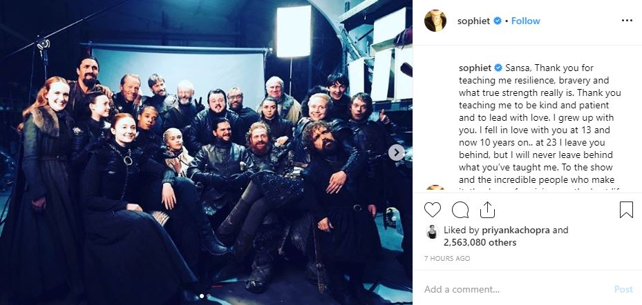 Sophie Turner, who plays Sansa Stark, shared a group picture featuring most of the season eight cast along with a message dedicated to her character Sansa Stark.