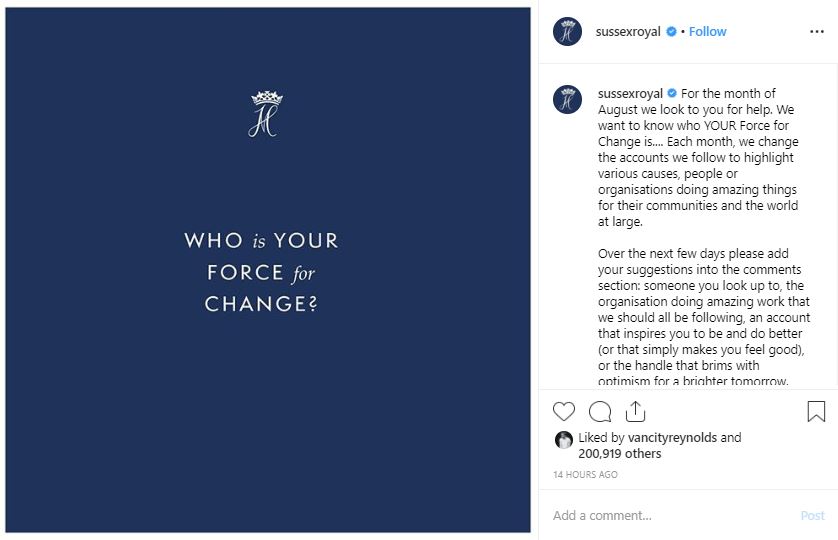 "For the month of August we look to you for help. We want to know who YOUR Force for Change is.... Each month, we change the accounts we follow to highlight various causes, people or organisations doing amazing things for their communities and the world at large," they shared via their official handle.