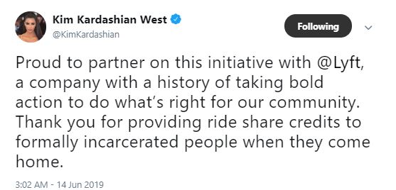 "Proud to partner on this initiative with @Lyft, a company with a history of taking bold action to do what's right for our community. Thank you for providing rideshare credits to formally incarcerated people when they come home," she said in a tweet.