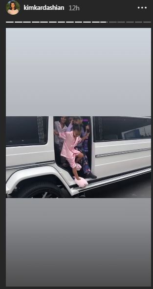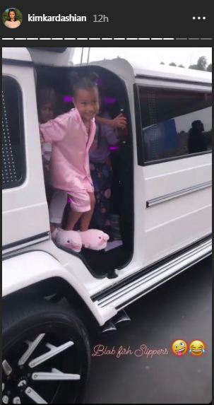 In one of the videos, North is one of the first girls to excitedly come out of the limo, wearing a set of silk pink pyjamas and matching blob fish slippers. The 6-year-old completed her look in a bun.