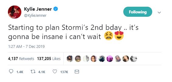 "Starting to plan Stormi's 2nd bday .. it's gonna be insane i can't wait," tweeted Jenner on Saturday.