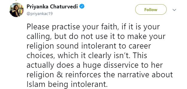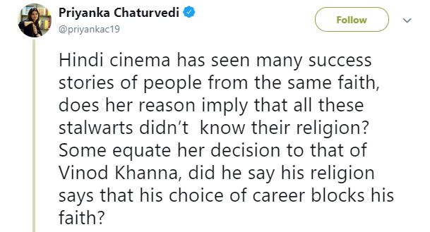 Chaturvedi said tht it is "unfortunate" that the decision was taken on the basis of her acting career hindering her practice of following the Islam religion.