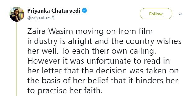 Priyanka Chaturvedi criticises Zaira Wasim for making Islam sound "intolerant to career choices"