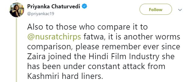 "Also to those who compare it to @nusratchirps fatwa, it is another worms comparison, please remember ever since Zaira joined the Hindi Film Industry she has been under constant attack from Kashmiri hard liners," she tweeted.
