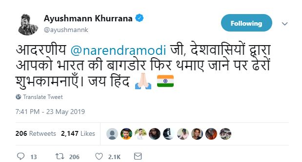 Singer-actor Ayushmann Khurrana extended his greetings through social media and said, "Respected narendramodi ji, many good wishes on the occasion of India's reinstatement by the countrymen. Jai Hind"