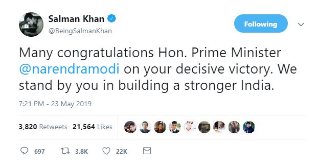 Praising the Prime Minister over the decisive victory, Salman Khan wrote on his Twitter handle, "Many congratulations Hon. Prime Minister narendramodi on your decisive victory. We stand by you in building a stronger India."