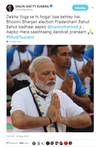 Wishing PM Modi, actor Shilpa Shetty posted a picture of the him performing yoga and wrote, "Dekha Yoga se hi hoga! Isse kehtey hai. Bhoomi Bhanjan election Pradarshan! Bahut Bahut badhaai aapko @narendramodi ji . Aapko mera saashtaang dandvat pranaam #ModiTsunami"