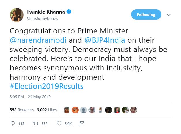 Twinkle Khanna, who recently made news after she took an apparent jibe at Prime Minister Narendra Modi's meditation session in Kedarnath caves, congratulated BJP on its "Sweeping victory."