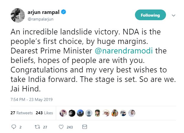 Actor Arjun Rampal also took to his Twitter handle to share a victorious remark. He wrote, "Brilliant landslide victory. NDA is the people's first choice once more, by margins. Dear Prime Minister @PM_Narendermodi the belief of this nation, it's hopes are in your hands, unprecedented. Congratulations and best wishes in taking our nation forward. The foundation is laid."