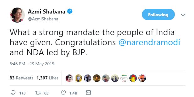 Praising the decision made by people of India, Shabana Azmi wrote, "What a strong mandate the people of India have given. Congratulations @narendramodi and NDA led by BJP."