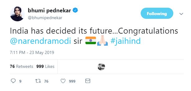 Expressing her happiness over PM Narendra Modi victory, actor Bhumi Pendharkar wrote on social media, "India has decided its future...Congratulations narendramodi sir #jaihind"