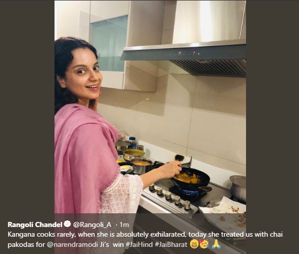 Actor Kangana Ranaut who recently came back from 72nd Cannes Film Festival celebrated the victory by making chai and pakodas. Her sister, Rangoli Chandel took to her Twitter account to share a picture of kangana preparing pakodas in kitchen and wrote, "Kangana cooks rarely, when she is absolutely exhilarated, today she treated us with chai pakodas for narendramodi Ji's win #JaiHind #JaiBharat"