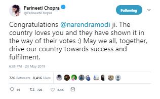 "Congratulations to Prime Minister Narendra Modi and BJP on their sweeping victory. Democracy must always be celebrated. Here's to our India that I hope becomes synonymous with inclusivity, harmony and development #Election2019Results," she tweeted.
