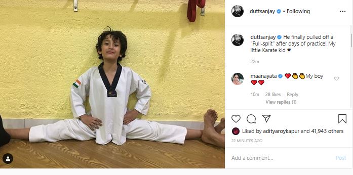 Expressing his pride and happiness, Dutt took to Instagram on Friday and shared a picture of his 9-year-old son in the full-spit position.