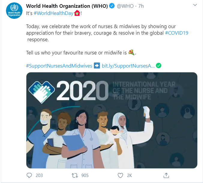 "It's #WorldHealthDay! Today, we celebrate the work of nurses & midwives by showing our appreciation for their bravery, courage & resolve in the global #COVID19 response. Tell us who your favourite nurse or midwife is," WHO tweeted.