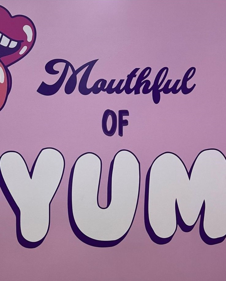 Lit up in shades of pinks, red, and blue the dessert bar offers visually entertaining cookies, cupcakes and waffles named with kinky phrases.
