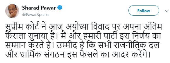 Taking to social media, he tweeted, "Supreme Court has given the final verdict today. Me and my party respect the decision of the apex court. Hope all political parties and religious institutions honor the decision".