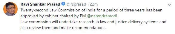 "22nd Law Commission of India for a period of 3 years has been approved by Cabinet chaired by PM Narendra Modi. Law Commission will undertake research in law and justice delivery systems and also review them and make recommendations," Prasad wrote on Twitter.