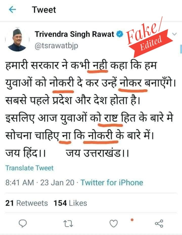 It further read that the original post by Rawat has been edited and an attempt has been made to tarnish his image.