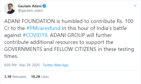 "ADANI FOUNDATION is humbled to contribute Rs. 100 Cr to the #PMcaresfund in this hour of India's battle against #COVID19," the 57-year-old industrialist tweeted.