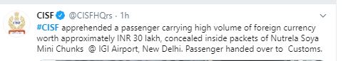 "CISF apprehended a passenger-carrying high volume of foreign currency worth approximately Rs 30 lakh, concealed inside packets of Nutrela Soya Mini Chunks IGI Airport, New Delhi. Passenger handed over to Customs," CISF wrote on Twitter.