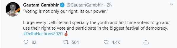 "Voting is not only our right. It's our power. I urge every Delhiite and especially the youth and first-time voters to go and use their right to vote and participate in the biggest festival of democracy. #DelhiElections2020," the East Delhi MP tweeted.