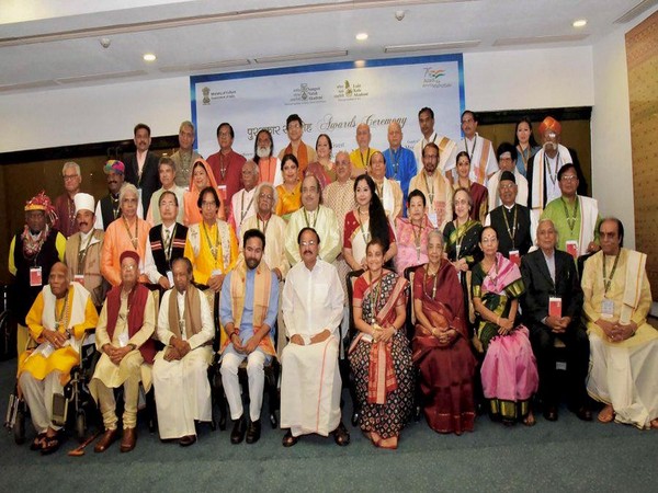 New Delhi [India], April 9 (ANI): Vice President M Venkaiah Naidu on Saturday awarded Sangeet Natak Akademi Award to Diwan Singh Bajeli for the year 2018 for his scholarship in the performing arts.