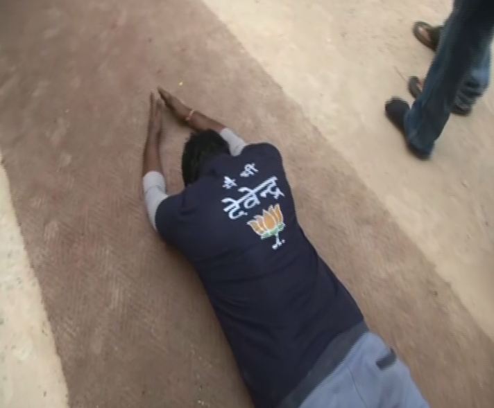 Vipin Telgote performed the ritual by bowing down in reverence as he reaches the temple. He also wore a t-shirt having 'Mai bhi Devendra' printed on it in Hindi, with BJP's lotus symbol below it.